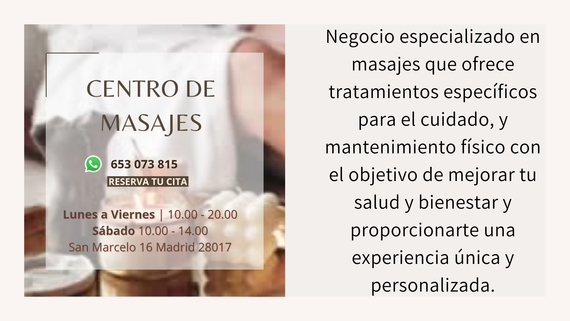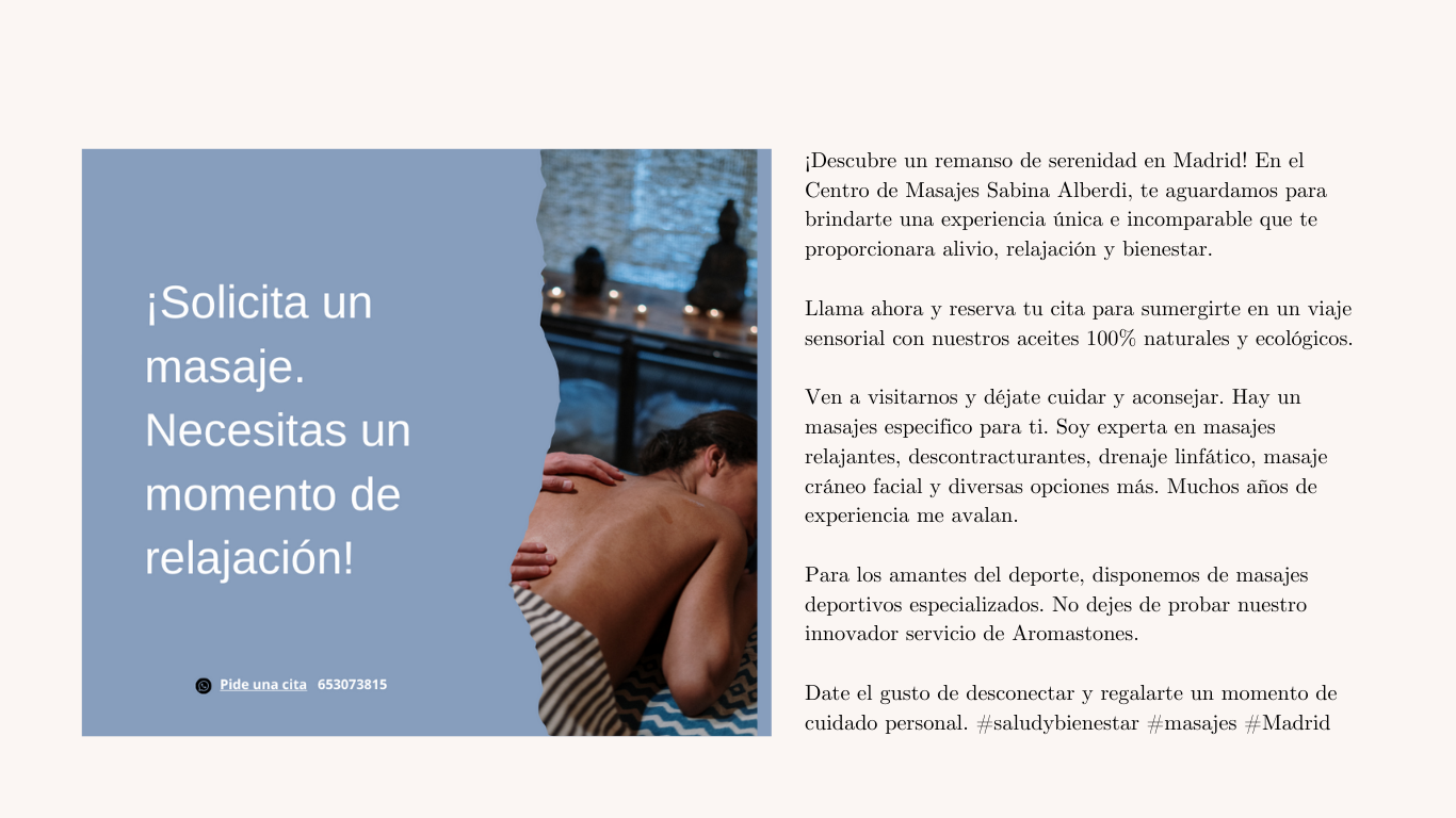 Abierto hasta las 20.00 de lunes a viernes Sábados de 10.00 a 14.00 Domingos y festivos cerrados. Urgencias: 653073815 Descubre un remanso de serenidad en Madrid. En el Centro de Masajes Sabina Alberdi, te aguardamos para brindarte una experiencia única e incomparable que te proporcionará alivio, relajación y bienestar. Llama ahora y reserva tu cita…