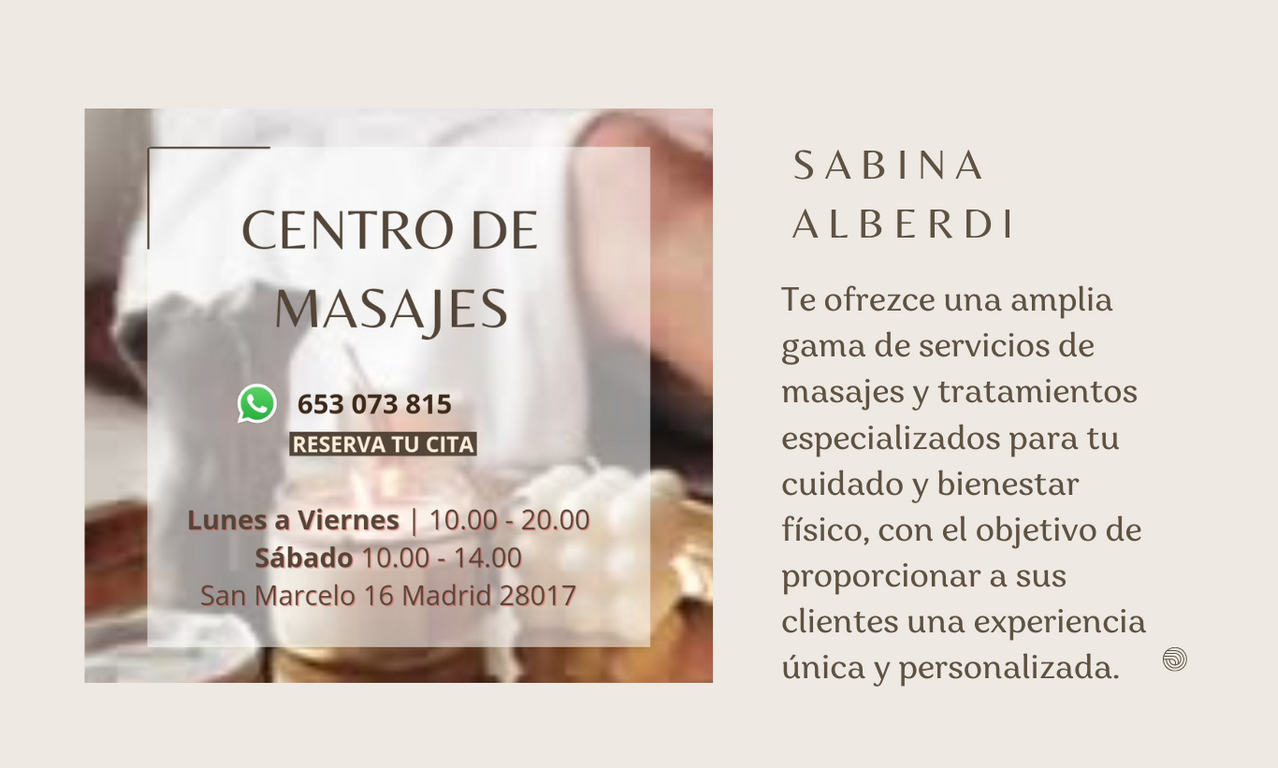 Visítanos en nuestras redes sociales. Ponte en contacto o chatea por WhatsApp. Si prefieres acercarte a nuestro Centro de Masajes, consulta nuestra ubicación. Buscanos en Google Maps como *Centro de Masajes Sabina Alberdi*